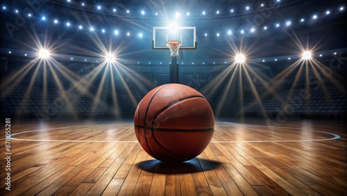 Empty basketball court with a red jersey and ball, spotlight shining, conveying intense competition and desire to win in a high-stakes game.