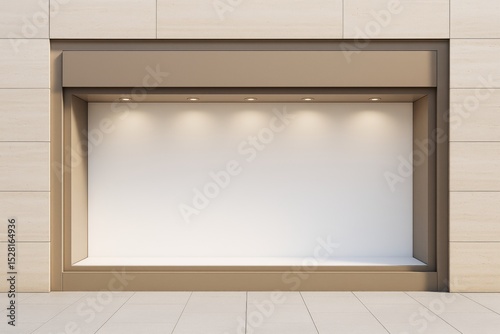 Empty beige storefront display with spotlights, ideal for branding, advertising, or poster mockup on modern tiled background. Ai generative.