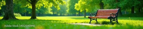 Empty bench, vibrant green park background Summer day , outdoor, summer, leaves