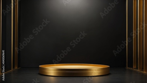 Empty black and gold geometric podium for the demonstration and installation of a product, cosmetics on a solid background, the indoor wall, Black friday, minimalism.