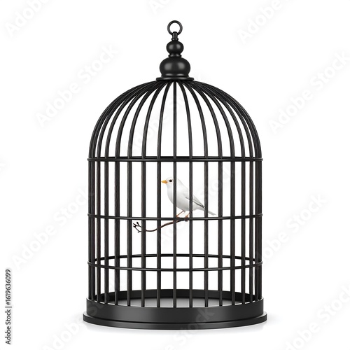 cage, bird, white, black, empty, confinement, freedom, trapped, isolated, interior, metal, ornate, design, three-dimensional, render, illustration, small, perspective, imagery, graphic, abstract, symbolism, imprisonment, restriction, captivity, nature, wildlife, rendering, digital, object, simple