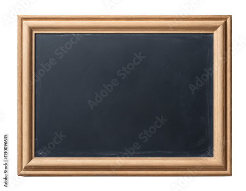 Empty black chalkboard with wooden frame, isolated on transparent background.