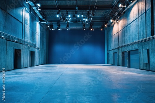 Empty blue-walled industrial event space, stage lighting, concrete floor