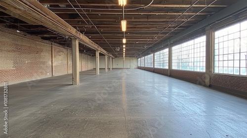 empty, warehouse, facility, restricted, access, urban, location, interior, space, bright, wide, angle, storage, concept, bonded, environment, view, industry, commercial, light, architecture, design, property, renovation, ceiling