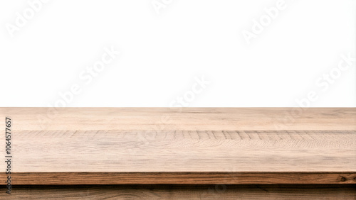Empty brown wooden table top isolated on a clean white background, showcasing its natural texture and color.