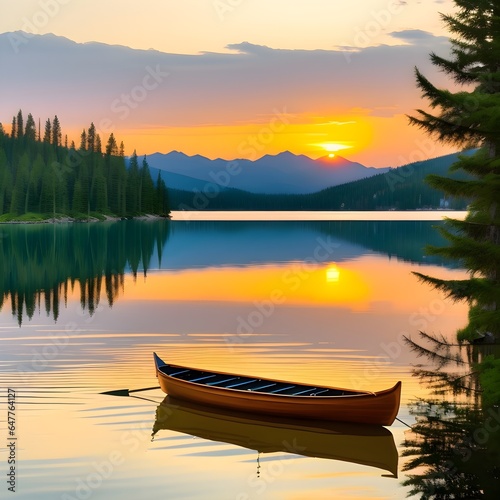 Empty canoe floating on a calm & quiet lake. Scenic sunset view is visible in the background - Generative AI