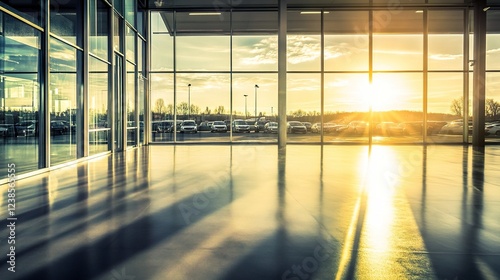 Empty car dealership lot at sunset, showcasing a serene and quiet atmosphere with no vehicles or customers, reflecting the end of a business day and the transition to evening calm.