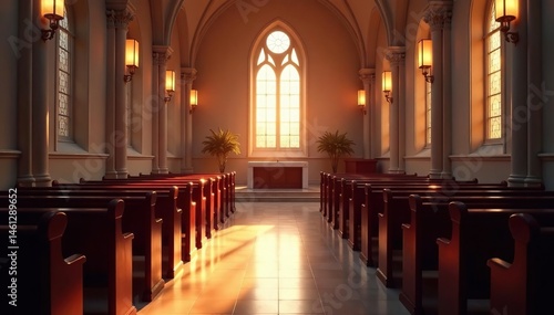 Empty church pews, soft light illuminating the altar , calm, hope