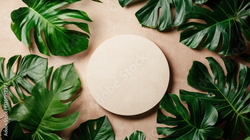 circle, display, tropical, leaf, nature, background, empty, product, decor, design, floral, arrangement, presentation, modern, beige, blank, round, botanical, plant, green, summer, pattern, frame, decorative, background, texture, minimalist, aesthetic, leaf, trendy, concept, natural, studio, photo, empty space, composition, display stand