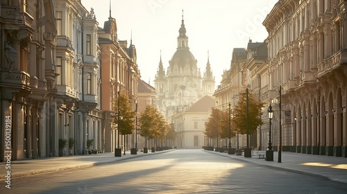 street, church, building, architecture, sky, tree, road, city, empty, urban, light, morning, sunlight, europa, european, classic, ornate, dome, church steeple, facades, pillar, window, balcony, paving, stone, perspective, vanishing, point, symmetric, design, pattern, shadow, sunrise, haze, lamp, vintage, style, nobody, central, town, capital, historic, city landscape, landmark