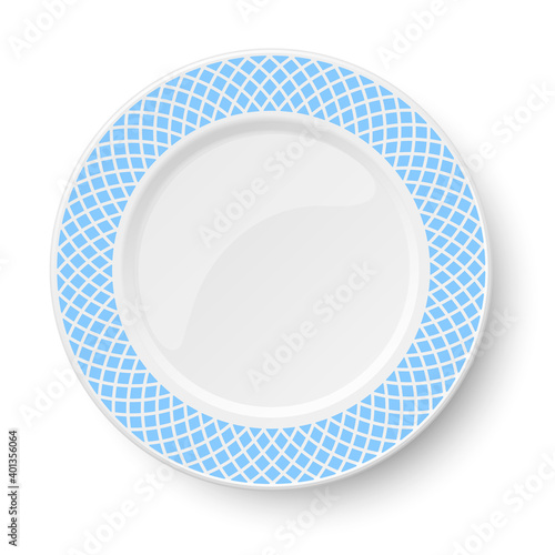 Empty classic white vector plate with light blue pattern isolated on white background. View from above.