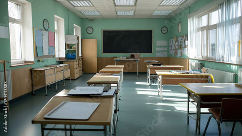 Empty classroom with desks, chalkboard, and natural light creating serene atmosphere