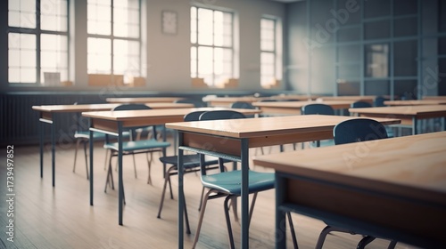 Empty Classroom with Rows of Wooden Desks and Chairs Illuminated by Bright Natural Light