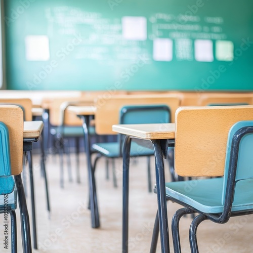 Empty Classroom With Wooden Desks and Teal Chairs, Back to School Concept Photography.