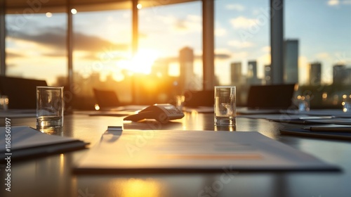 meeting, office, business, sunset, city, conference, room, table, window, skyscraper, urban, work, corporate, empty, glasses, document, interior, light, modern, workspace, architecture, evening, sky, view, sunshine, gold, dawn, dusk, skyline, city landscape, desk, chair, paper, professional, space, design, contemporary, furniture, indoor, bright, workplace, elegance, success, finance, communication, strategy, planning, blank, notebook