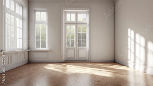 Empty door opened light. Light shining through open door 3D realistic Illustration