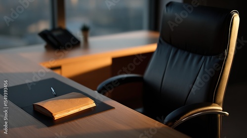 office, desk, chair, leather, wood, sunset, light, warm, empty, executive, notebook, pen, city, vista, view, window, building, modern, professional, business, corporate, elegant, sophisticated, luxury, roomy, room, workplace, workspace, furniture, interior, design, style, gold, shadow, quiet, calm, serene, solitude, stillness, vacant, unoccupied, neat, tidy, organised, clean, simple, minimalist, brown, black