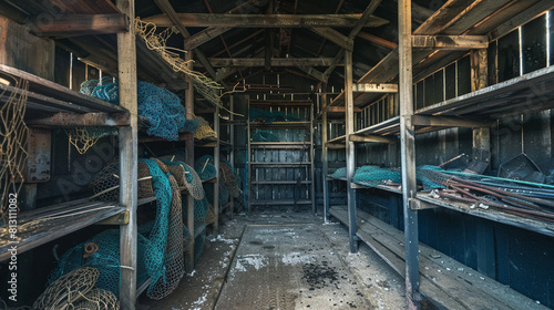 Empty fishing gear shed with racks for rods and nets, all conspicuously absent, a salty air filling the space.