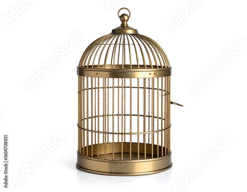 gold, empty, cage, metal, round, top, bottom, open, door, isolated, white, background, three-dimensional, illustration, decorative, empty space, freedom, privacy, captive, ornate, design, metalwork, luxury, interior, object