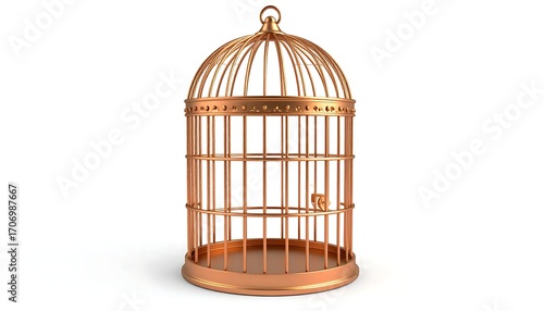 cage, bird, empty, gold, metal, freedom, confinement, isolated, three-dimensional, render, decorative, ornate, luxury, constraint, gaol, solitary
