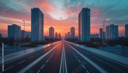 Empty highway leading to city skyline at sunrise with dramatic colorful sky and modern buildings