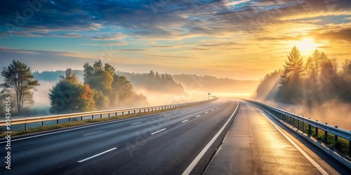highway, sunrise, misty, forest, asphalt, dawn, nature, scenic, countryside, travel, adventure, empty, rural, morning, sun, light, fog, tree, lane, green, gold, cloud, sky, hill, mountain, road, paved, direction, journey, landscape, backroad, path, horizon, open, destination, freedom, peaceful, calmness, solitude, silence, serene, quiet, wild, blue, yellow, orange, red, white