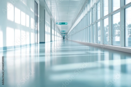 hospital, corridor, hallway, empty, clean, sterile, modern, interior, architecture, building, light, sunlight, window, design, health care, medicine, patient, doctor, nurse, emergency, exit, signs, safety, cleanliness, empty space, hospitality, facility, professional, future, technology, innovation, bright, vacant, professionalism, white, blue, perspective, depth, medicals