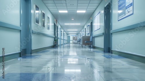 empty, hospital, corridor, floor, clean, shiny, station, further, away, poster, wall, giving, information, health, clinic, medicals, medicine, room, ward, indoor, hall, building, emergency, interior, modern, care, hallway, background, blue, architecture, inside, professional, entrance, white, door, doctor, office, perspective, people, science, health care, abstract, light, health care, equipment, nursing, laboratory, assistance