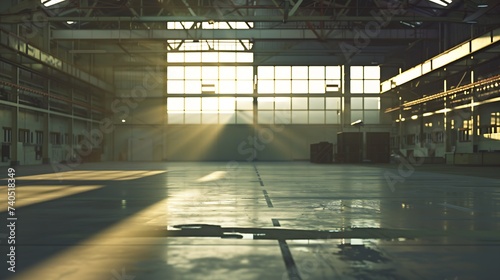 Empty industrial building. Spacious hangar without anyone. Empty factory with concrete floor. Hangar with high roof. Location for production equipment. Industrial background. 3d image : Generative AI