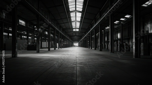 warehouse, empty, industrial, building, structure, interior, window, concrete, floor, steel, beam, column, light, dark, shadow, abandoned, neglected, forgotten, deserted, desolate, huge, roomy, silence, quiet, stillness, perspective, line, geometry, architecture, design, construction, metal, grey, monochrome, black, white, photo, photo, image