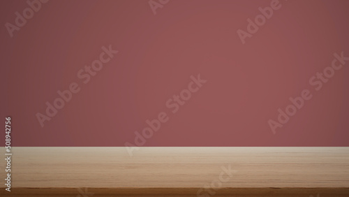 Empty interior design concept, wooden table, desk or shelf close up. Red colored background with copy space, template mock up concept idea