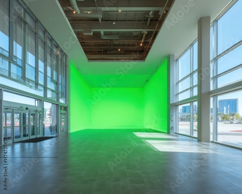 Empty interior space with a bright green wall modern architecture with large windows