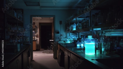 laboratory, science, research, teal, fluorescent, light, equipment, chemistry, biology, laboratory, empty, dark, still, quiet, illumination, interior, corridor, cabinet, shelf, bottle, volumetric, flask, beaker, test, tube, scientific, investigation, experiment, researcher, modern, vintage, wood, copy, space, photo, image, illuminated, medicals, educational, background