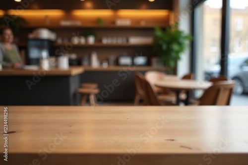 Empty Light Wood Table in a Cozy Cafe Setting with Blurred Background