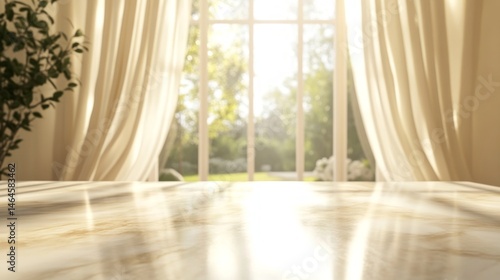 window, curtain, room, daylight, sunlight, view, garden, table, marble, beige, cream, white, interior, home, apartment, decor, empty, background, nature, calm, peaceful, bright, soft light, morning, empty space, staging, modern, minimalist, luxury, elegant, display, window sill, plant, tree, cosy