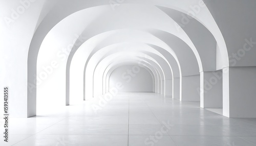 Empty minimal abstract architectural hall with a long corridor of repeating white arches. Bright, futuristic interior with clean lines, light and shadow play, and a sense of infinite space.