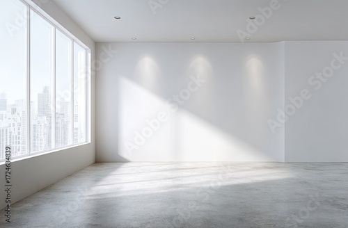 room, empty, modern, city, view, window, light, bright, roomy, clean, concrete, floor, wall, white, minimalist, sunlight, shadow, interior, design, architecture, empty space, contemporary, urban, city landscape, illuminated, large, daylight, industrial, simple