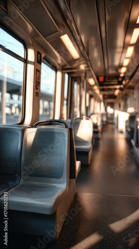 Empty Modern Subway Car, Sunlight Streaming Through Windows