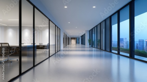 office, hallway, empty, interior, modern, architecture, building, contemporary, workspace, design, corporate, business, indoor, window, light, city landscape, night, urban, view, perspective, clean, bright, long, corridor, sterile