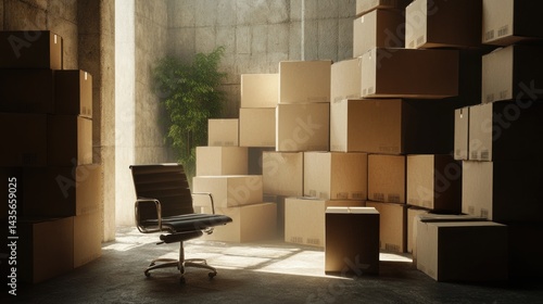 office, chair, box, cardboard, empty, room, space, sun, light, building, interior, relocation, move, storage, warehouse, industrial, concrete, floor, wall, dust, shadow, furniture, business, workplace, company, departure, leaving, transition, change, new, beginning, end, future, past, opportunity, potential, growth, success, bankruptcy, organisation, packing, shipping, logistic, inventory, stack