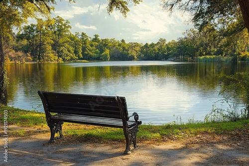 Empty park bench by a calm reflective lake surrounded by sunlit trees, a peaceful contemplative late afternoon scene