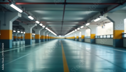 Empty parking garage interior shows spacious hall with smooth floor. Daylight illuminates corridor. Columns, walls light gray, yellow. Modern architecture, urban design. Building likely underground