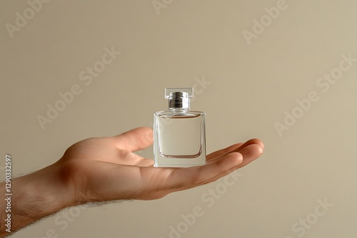 perfume, bottle, fragrance, hand, empty, glasses, modern, elegant, luxury, clear, product, cardboard box, display, advertising, still life, beauty, cosmetic, simple, minimalist, light, neutral, sophisticated, detail, closeup, presentation