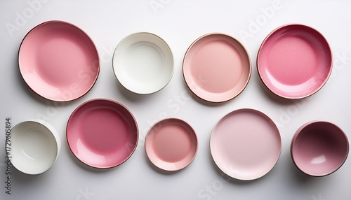 Empty Pink And White Ceramic Plates On A White Background Creative Flat Lay Minimal Tableware