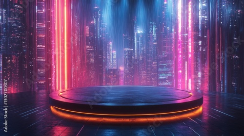 Empty podium set against a backdrop of futuristic digital skyscrapers, with neon light trails and digital rain falling