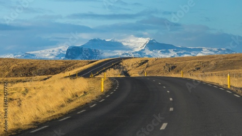 Empty road surrounded by fields with snowy mountain in the background