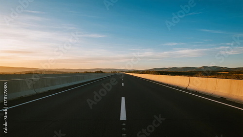 road, sky, horizon, landscape, highway, empty, clear, blue, sunrise, sunset, view, perspective, open, straight, asphalt, concrete, barrier, mountain, distant, calm, serene, travel, journey, direction, freedom, road trip, empty road, natural light, daytime, scenery, panoramic, mountain chain, sunlight, open road