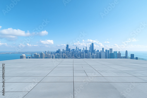 rooftop, empty, city, skyline, urban, modern, architecture, skyscraper, building, foreground, open, space, concrete, floor, horizon, background, perspective, sky, blue, cloud, panoramic, downtown, office, exterior, tower, tower block, urbanisation, scene, structure, landscape, corporate, clean, roomy, minimal, outdoors, professional, environment, modernity, contemporary, futuristic, polished, design, industrial, aerial, daytime, view, open air, simplicity, abstract