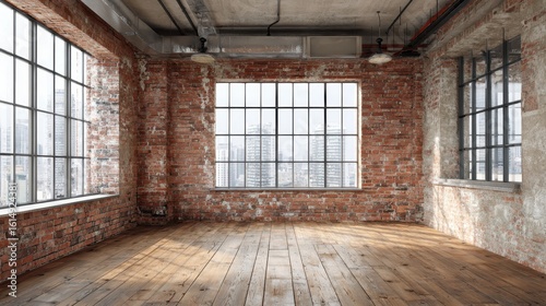 empty, room, interior, brick, wall, wooden, floor, window, city landscape, light, bright, industrial, architecture, design, space, building, vintage, loft, style, urban, perspective, texture, pattern, construction, modern, nobody, daylight, hardwood, surface, structure, home, apartment, residence, property, real, estate, indoor, open, blank, clean, clear, rendering, three-dimensional, background, scene, view, horizon, city