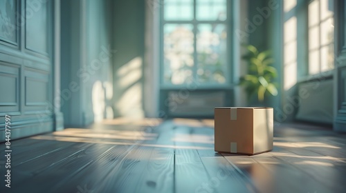 Empty Room with Solitary Moving Box in Blurred Minimalist Interior Design